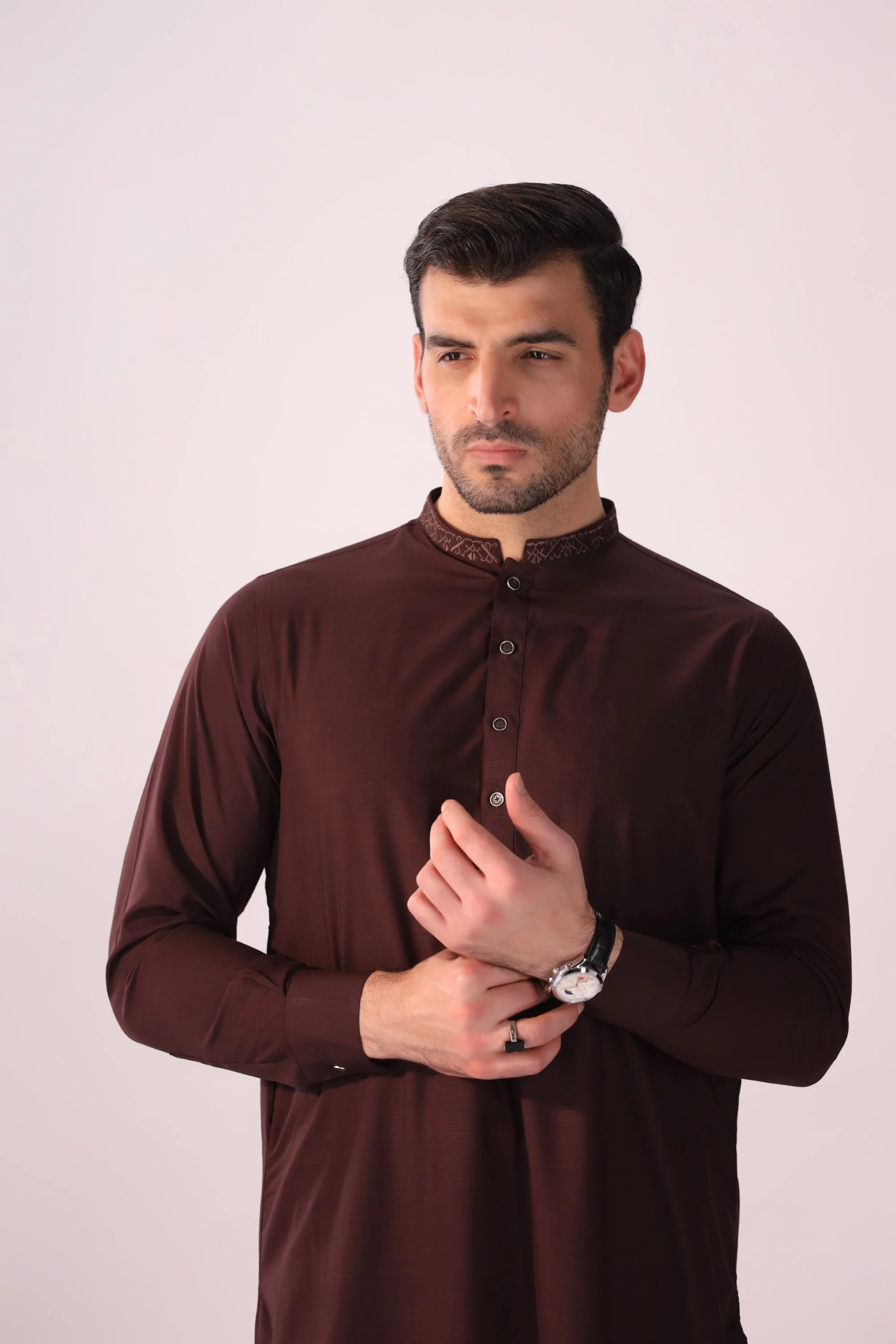 - Collar Style: Embroidered Band Collar